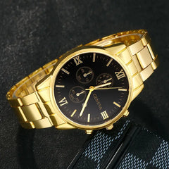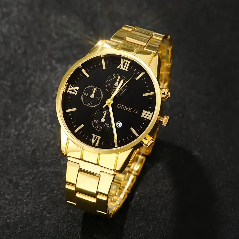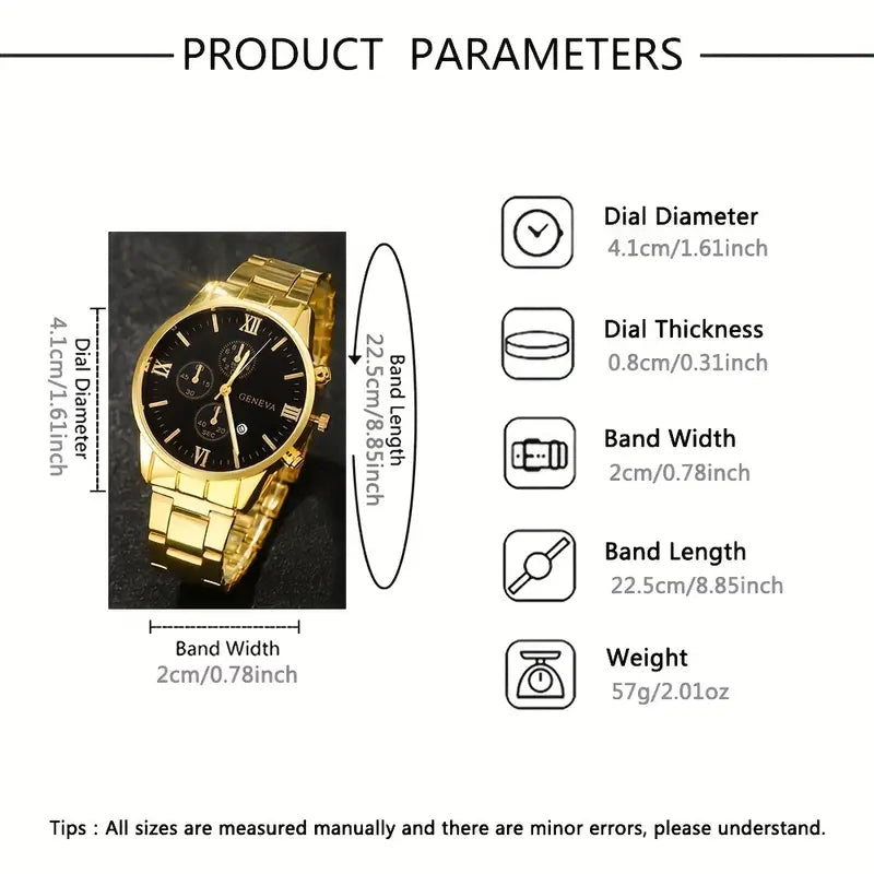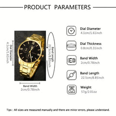 2pcs Men's Elegant Golden-Toned Quartz Watch with Roman Numerals & Stainless Steel Band + Classic Chain Bracelet - Ideal for Back to School, Valentine's, Christmas Gifts, Watch Accessories