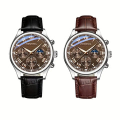 Men's Fashion Casual Black & Brown Quartz Watch Set, Round Roman Numeral Dial, PU Strap, Fake Three-Hand Design Style - Battery Operated with Electronic Button, Alloy Case - Ideal Gift for Valentine's Day, Easter, Ramadan, Birthday, Christmas