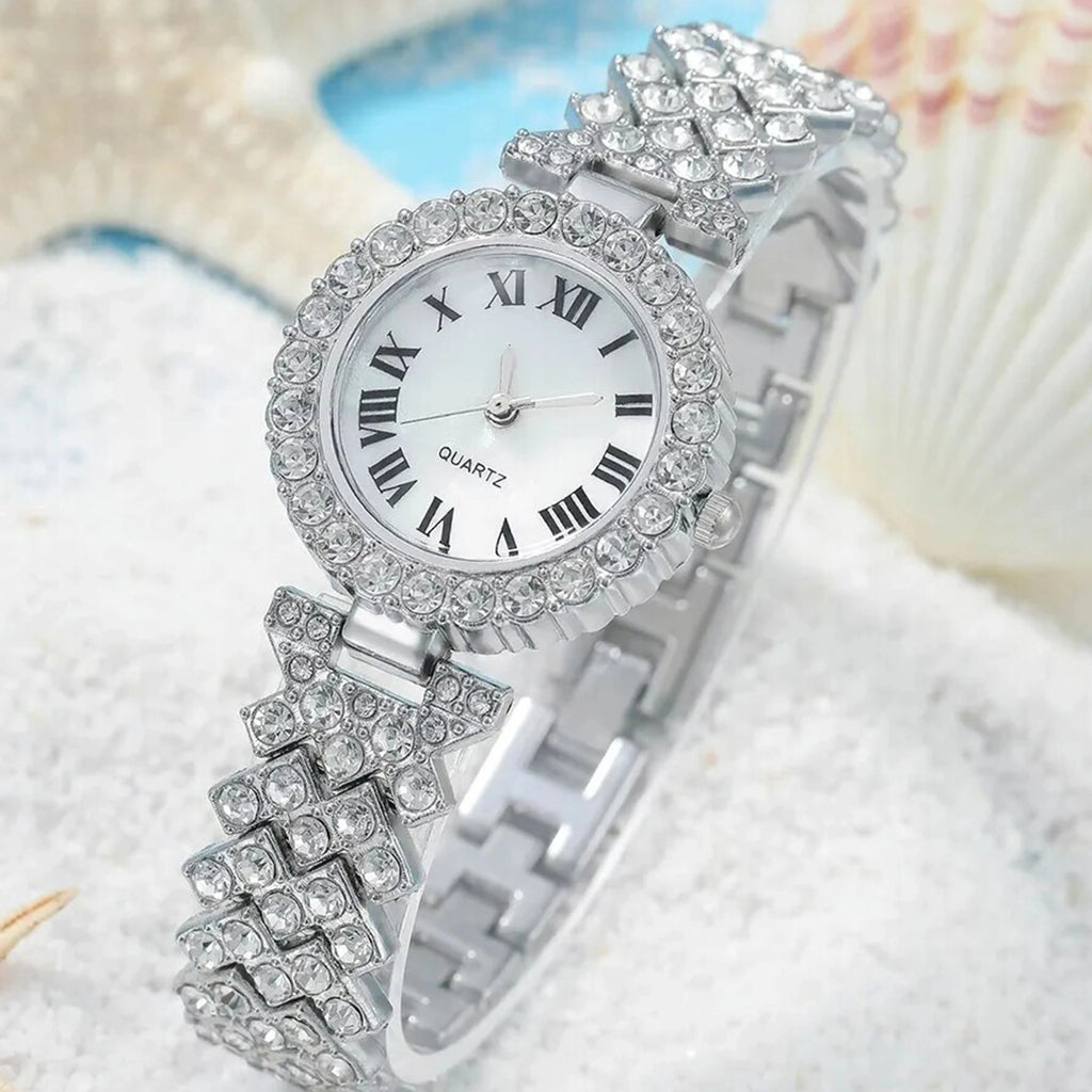 Elegant Design: Features a classic Roman numeral dial with sparkling diamond-like accents for a luxurious, timeless look.